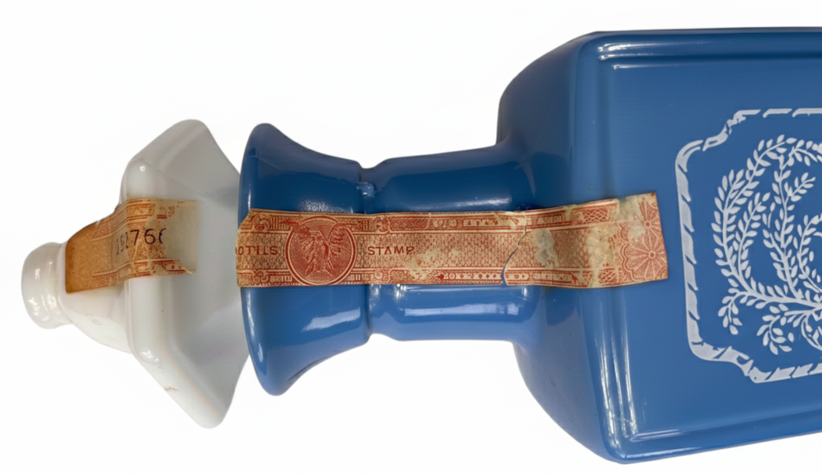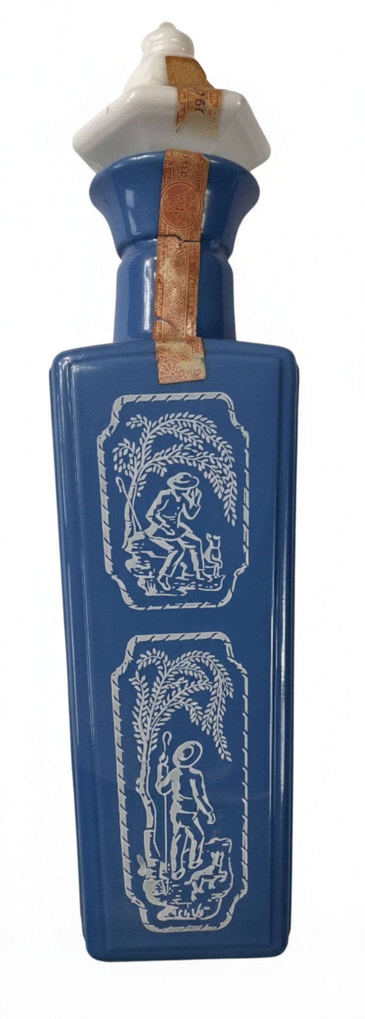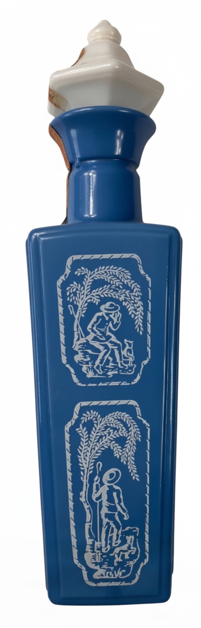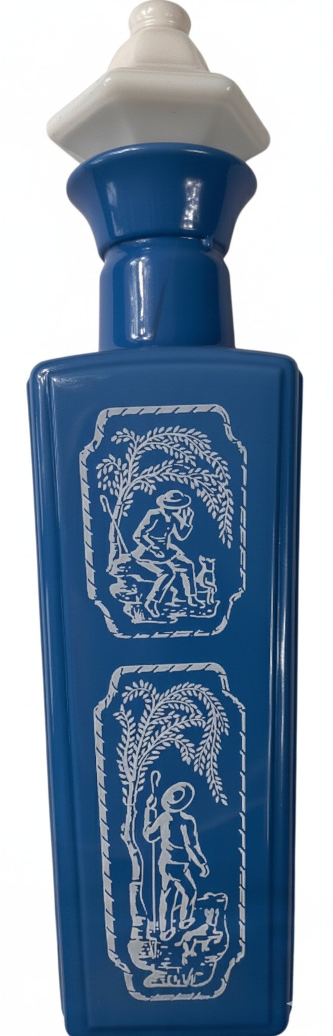 Own a piece of bourbon history with this stunning 1965 Jim Beam “Shepherd Cameo” blue milk glass decanter. This beautiful collectible features an elegant shepherd cameo design pressed into lustrous blue milk glass, making it a standout piece for any vintage spirits collection.
